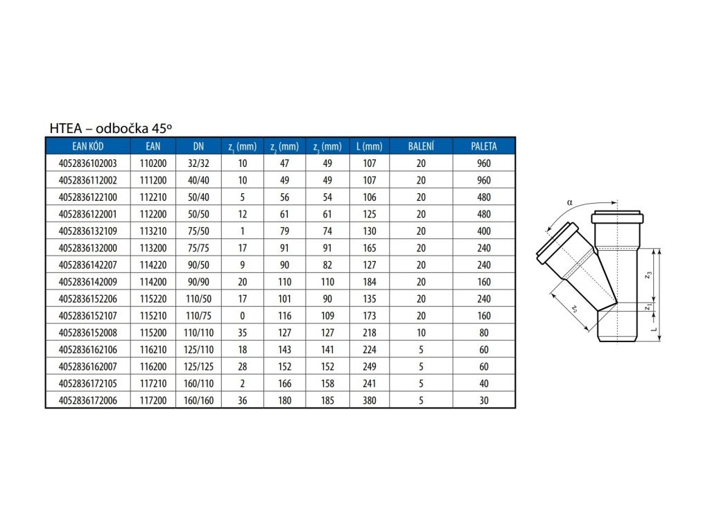HT PLUS HTEA je robustní odbočka z polypropylenu (PP), určená pro odpadní instalace s hlavním potrubím DN 110 mm a napojením vedlejší větve DN 75 mm pod úhlem 45°. Tento design umožňuje hladký přechod průměrů bez turbulencí a s minimální hladinou hluku. Hladký vnitřní povrch zabraňuje usazování nečistot a zajišťuje bezproblémový odtok.