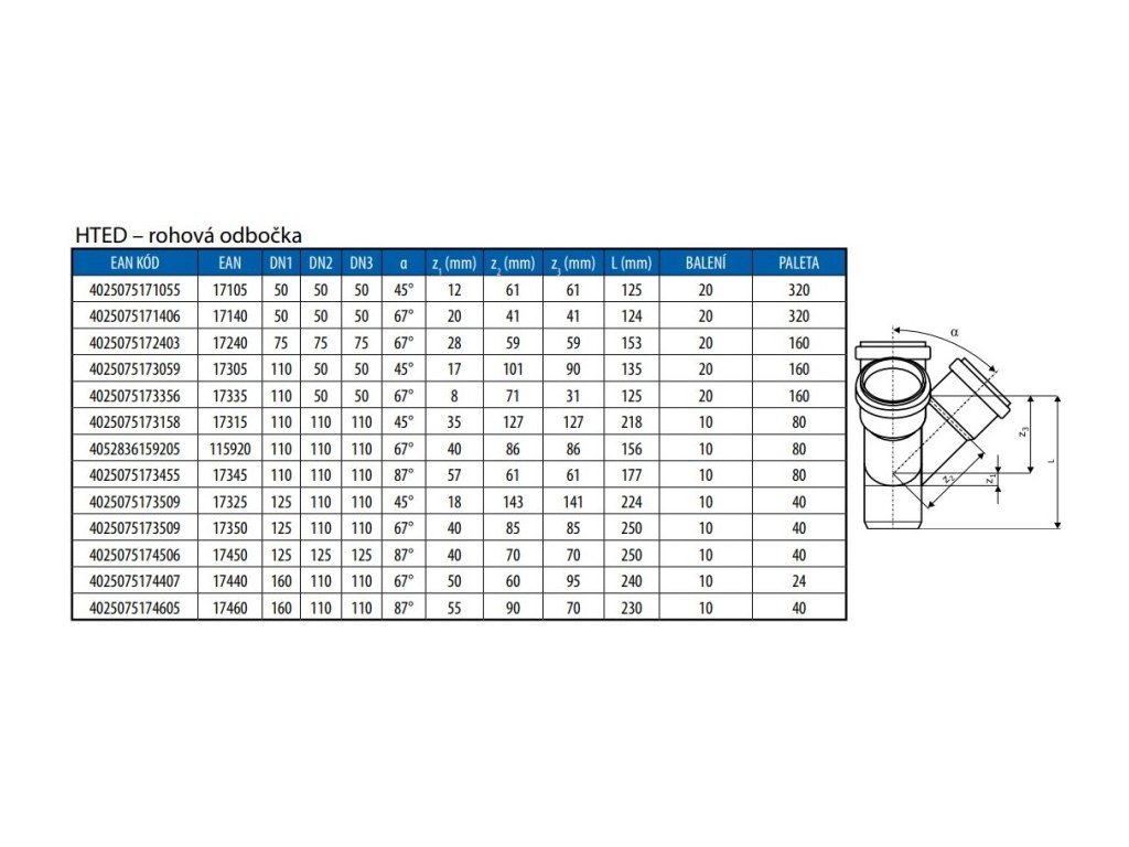 HT PLUS HTED je vysoce kvalitní rohová odbočka vyrobená z odolného polypropylenu (PP), navržená pro odpadní systémy s hlavním potrubím DN 125 mm a dvěma bočními větvemi DN 110 mm pod úhlem 45°. Tato elegantní tvarovka umožňuje kompaktní a plynulou změnu směru odtoku a podporuje hladký průtok díky hladkému vnitřnímu povrchu, který minimalizuje usazování nečistot a snižuje hlučnost. Je ideální volbou pro moderní rezidenční i komerční instalace, kde je důležitá estetika i funkčnost.