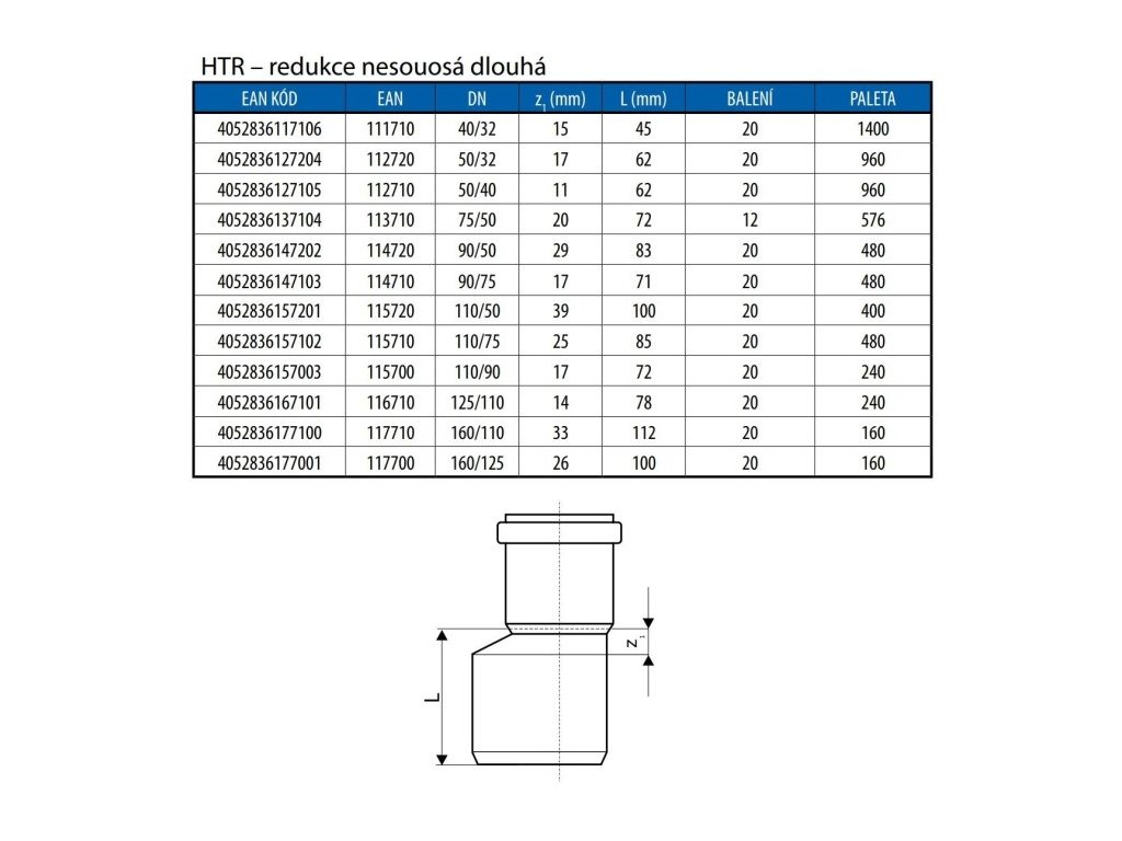 HT PLUS HTR redukce nesouosá dlouhá DN110/90, PP, šedá